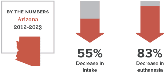 Fix.Adopt.Save. began in the Phoenix metropolitan area in 2012. From 2012 to 2022, the euthanasia rate in Maricopa County dropped 88.5% and dog and cat intake in area shelters dropped 58.3%.